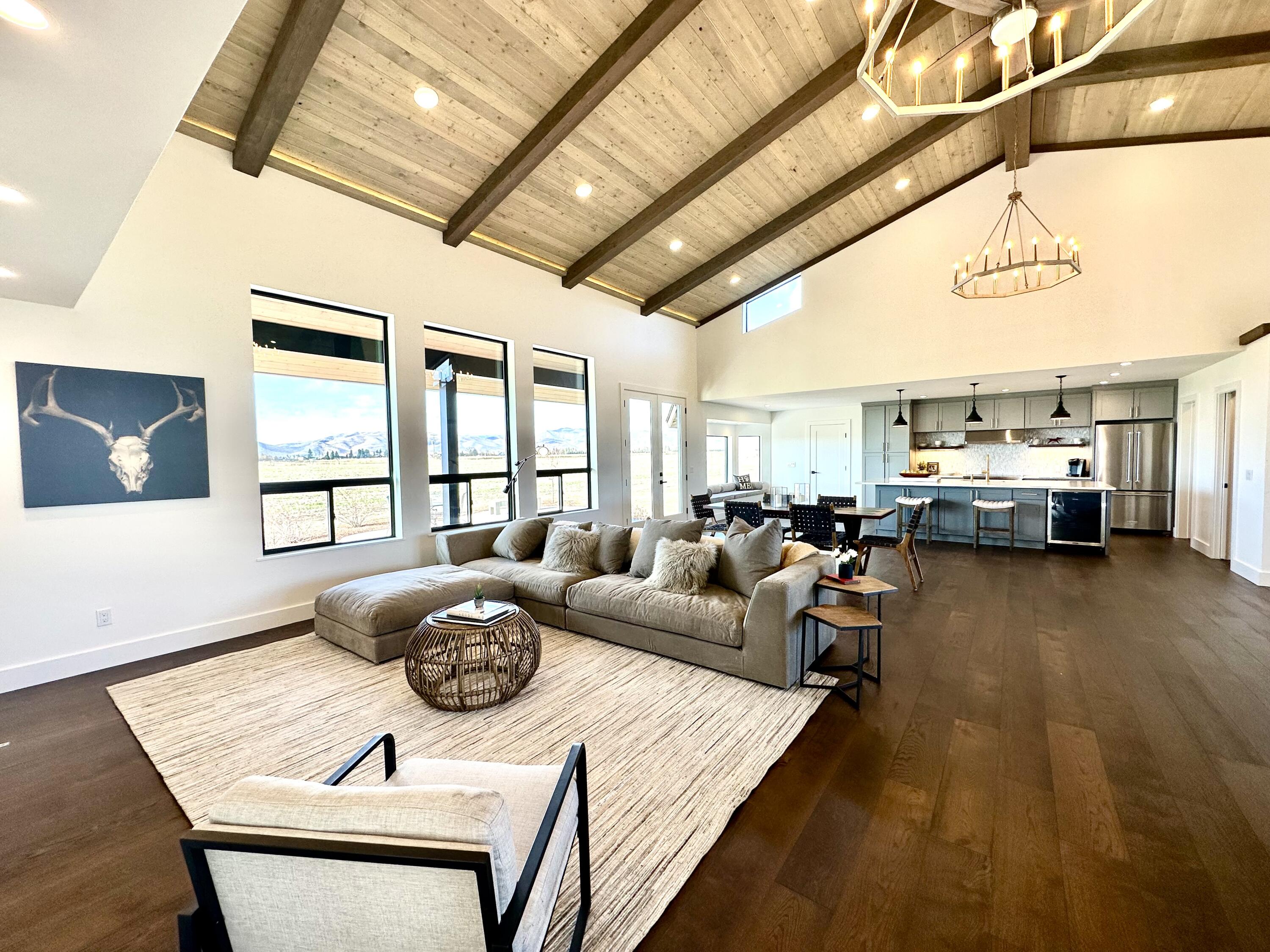 Discover serenity in this stunning 4-bedroom, 3-bathroom mountain modern retreat, just minutes from the renowned Sun Valley Ski Resort! The beautifully designed open floor plan with 20-foot cathedral ceilings invites abundant natural light, creating an airy atmosphere. The chef’s kitchen features an extra-large quartz island, perfect for entertaining. Outside, the paver terrace offers